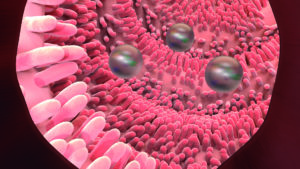 En el intestino por la acción del pH de los fluidos intestinales, el 100% de las proteínas terapéuticas y la proteína recombinante Proteoral® se liberan de las nanopartículas poliméricas. Con Proteoral®, el 75% de la dosis oral de la proteína administrada se absorbe en el torrente sanguíneo. Proteoral® desencadena la apertura temporal inocua de las uniones intercelulares de la pared intestinal y logra con éxito el paso transepitelial paracelular de los polipéptidos terapéuticos en los vasos sanguíneos (Imágenes 2 y 3). Las proteínas absorbidas en el torrente sanguíneo realizan con éxito y consistentemente su acción biológica en pacientes que reciben estas terapias.