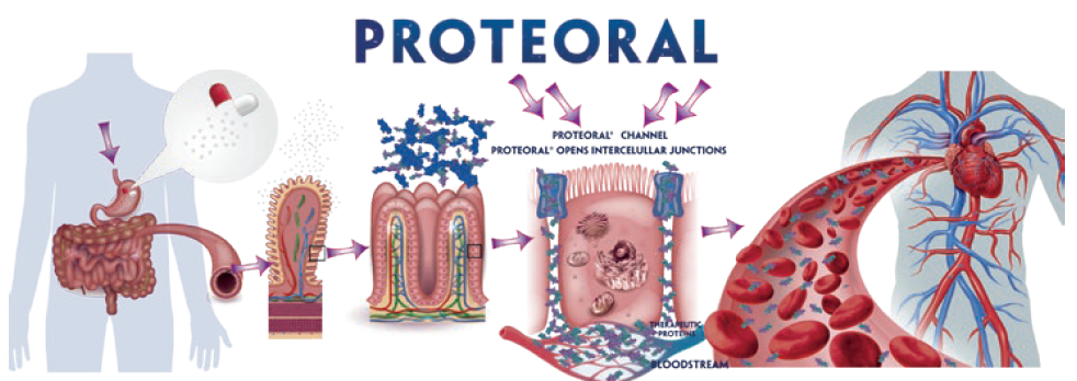 Proteoral® desencadena la apertura temporal inocua de las uniones intercelulares de la pared intestinal y logra con éxito el paso transepitelial paracelular de los polipéptidos terapéuticos en los vasos sanguíneos.”