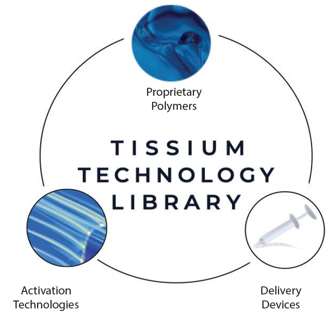 TISSIUM is currently expanding the range of applications for its core polymer platform. The unique ability of TISSIUM’s polymer platform to be leveraged in many different ways is due to the modular platform design: each use case leverages a targeted polymer formulation, distinct delivery device and specific activation technology (Figure 1).