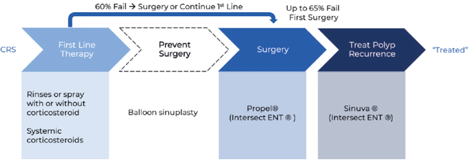 Regardless of the underlying etiology, all CRS patients endure a long treatment pathway which often does not provide effective treatment or long-term palliation of their disease (Figure 2). The combination of repeat medical management, office visits, sinus surgery and maintenance therapy costs the US a total of US$12 billion (£10 billion) per year in direct costs alone. While functional endoscopic sinus surgery (FESS) provides the most targeted therapy, it does not have long-term efficacy for up to 65% of patients, with 20% of them opting to undergo repeat surgery to “treat” their disease.3