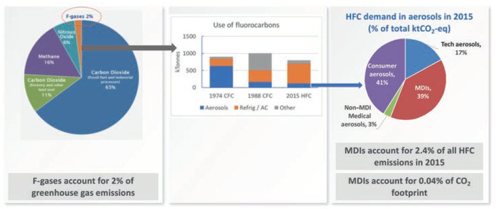 But the environmental story of pMDIs does not end there. In recent years, as the issue of sustainability has escalated to a climate emergency, the focus on limiting the use of products with the potential to impact the environment has become more acute. As a result, there is an emphasis on reducing the use of other fluorocarbons that have a global warming impact, beyond just CFCs.