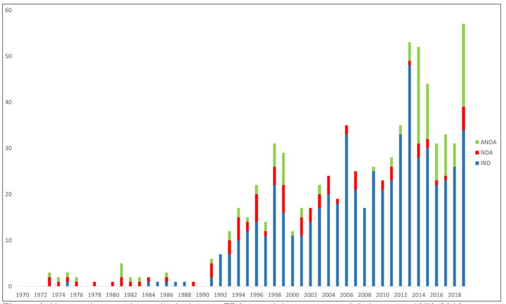 Figure 1: Human drug product submissions to FDA containing nanomaterials between 1970 and 2019.