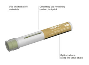 Figure 1: The YpsoMate Zero autoinjector with zero carbon footprint. The use of alternative materials, optimisations along the value chain and offsetting of the remaining carbon footprint result in a carbon emission free prefilled autoinjector without compromising on usability and patient safety.