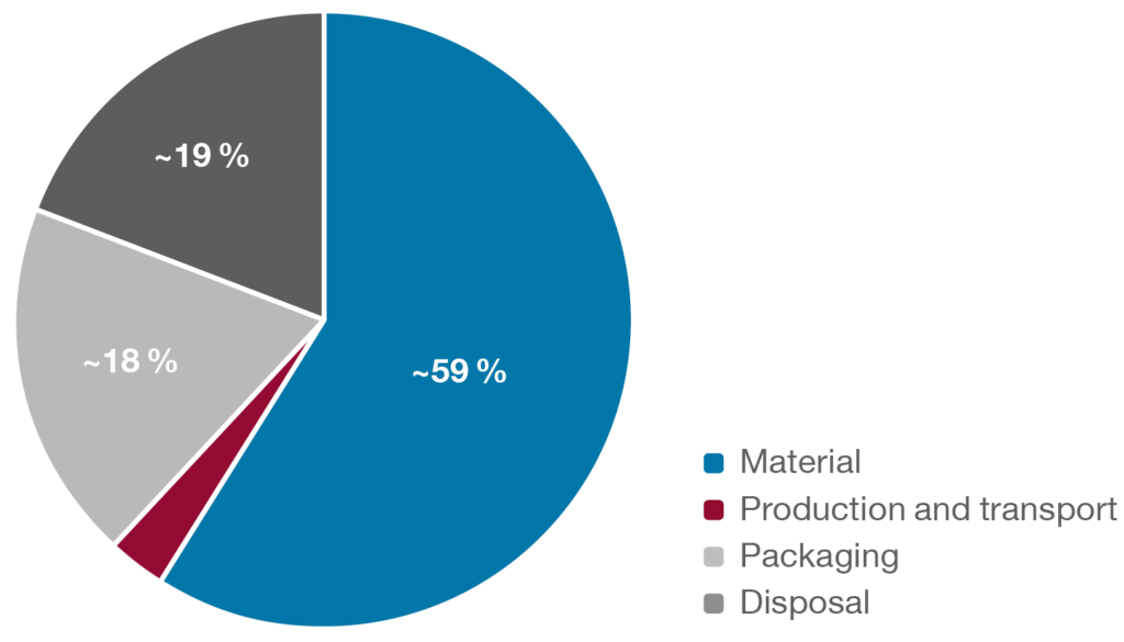 Not only did the lifecycle analysis assess those process steps controlled by Ypsomed, but also included the end of life of the final assembled drug product to better understand the environmental impact associated with its disposal. A breakdown of the total carbon emission of the YpsoMate autoinjector is shown in Figure 3. The lifecycle analysis highlighted the environmental hotspots and enabled evidence-based and data-driven design optimisations.