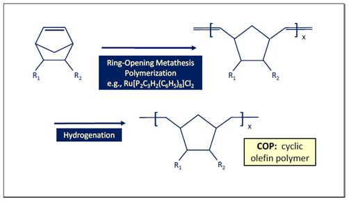 Figure 1: Structure and synthesis of a COP. Poly(norbornene) is represented where R1 and R2 are hydrogen.
