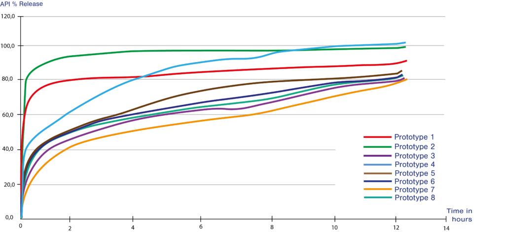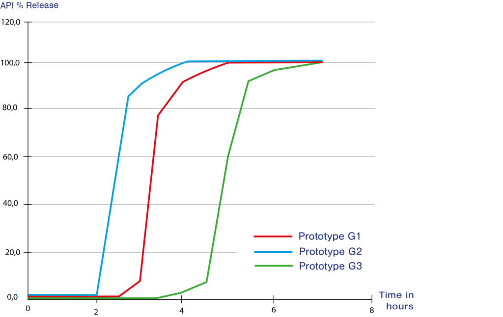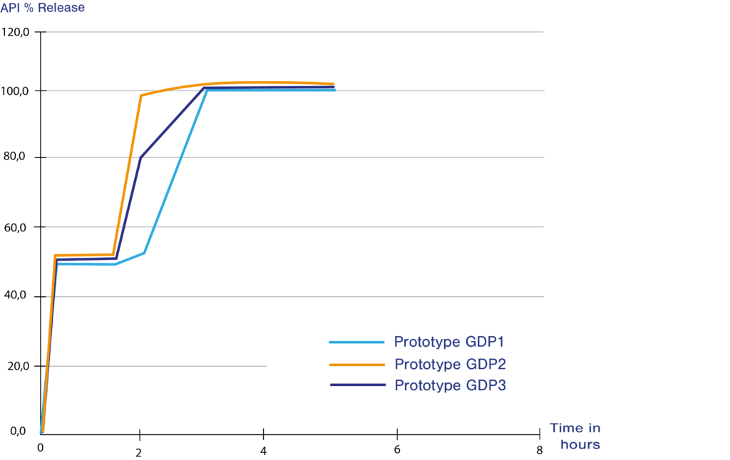 As slow-release layer behaviour is impacted by the tablet design (size, shape), excipients (type, amounts, viscosity grades) and process parameter, a wide range of parameters have been studied as well as their impact on dissolution profiles. Different profiles were obtained, thus demonstrating the versatility of the Geomatrix® technology for the obtention of sustained-release profiles, as illustrated in Figure 2. In this particular case study, our partner chose three prototypes with significantly different profiles for further preliminary clinical evaluation.