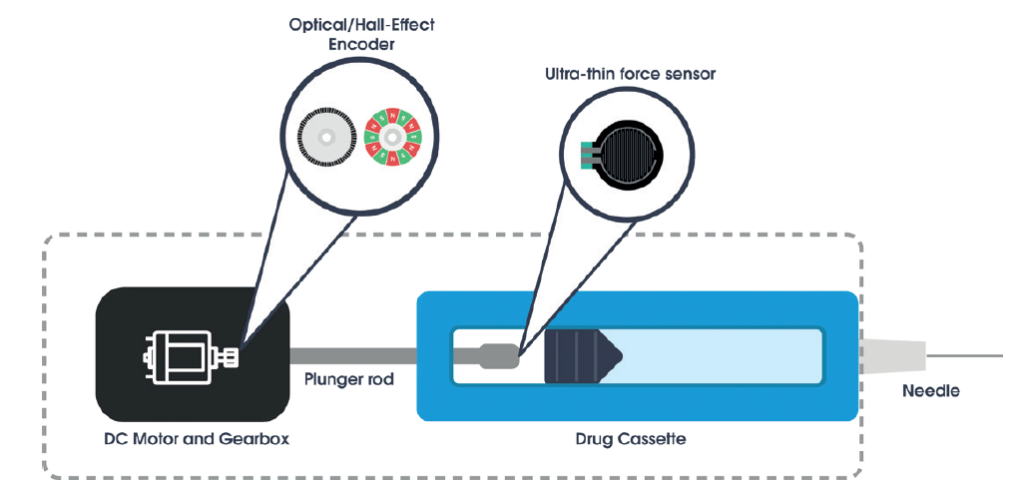 Embedding the ability to capture small changes to the actuation force on such tiny areas requires minimal electronics overhead to interface with the sensor – but greatly enhances the system’s reliability, since the autoinjector can now leverage interoperable control loop systems, each individually driven by feedback provided by dedicated sensors (Figure 4).