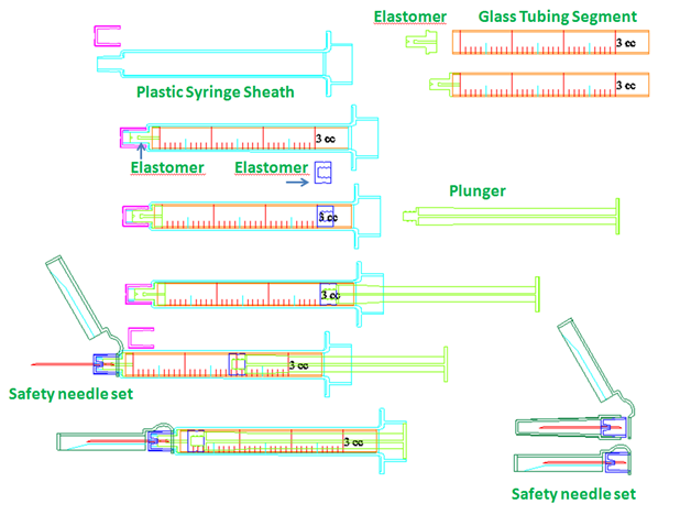 - A plastic syringe, made using standard precision mould injection mass production processes, which functions as a protective sheath fixed around the glass tube.