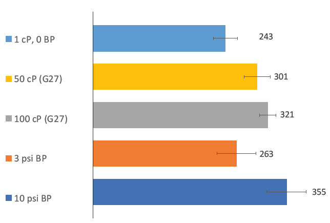 The injection time is repeatable, and the injector can overcome high viscosities and high back pressures (Figure 4). The average injection time for 1 cP (water) is about four minutes, 50 cP takes five minutes and 100 cP takes about five and a half minutes. The time for injection against an extreme condition of 10 psi is about six minutes. These data demonstrate that the wearable injector can generate a high force and that high viscosity has limited impact on injection time.