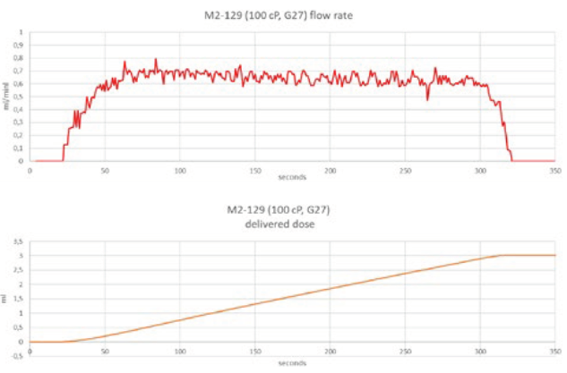 The flow rate profile is likewise consistent during the injection. A typical flow profile of a 100 cP viscosity injection is shown in Figure 5.