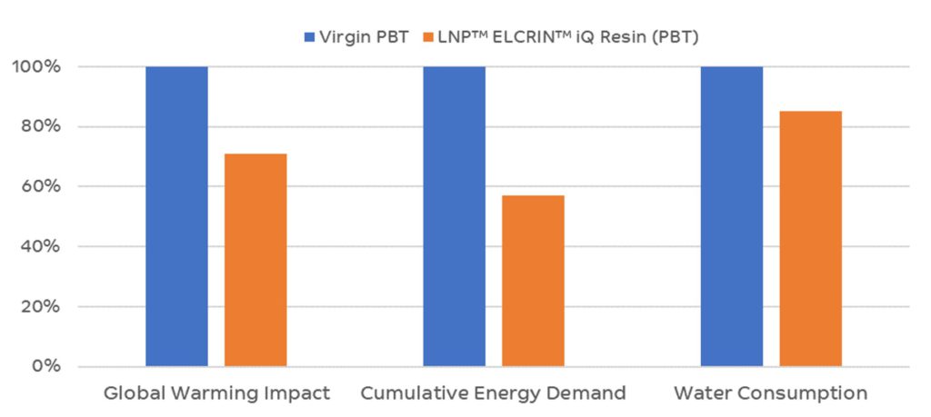 This analysis indicates that LNP ELCRIN W1000JiQ resin can be considered a more-sustainable, drop-in replacement for traditional PBT in many healthcare applications. This material also features formulation lock, US FDA food contact compliance and a stringent management of change process – and is produced according to GMPs.