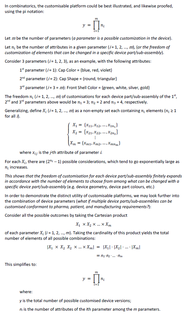 In combinatorics, the customisable platform could be best illustrated, and likewise proofed, using set theory and pi notation (Figure 1), allowing us to demonstrate the extent of possible device customisations using modular design.