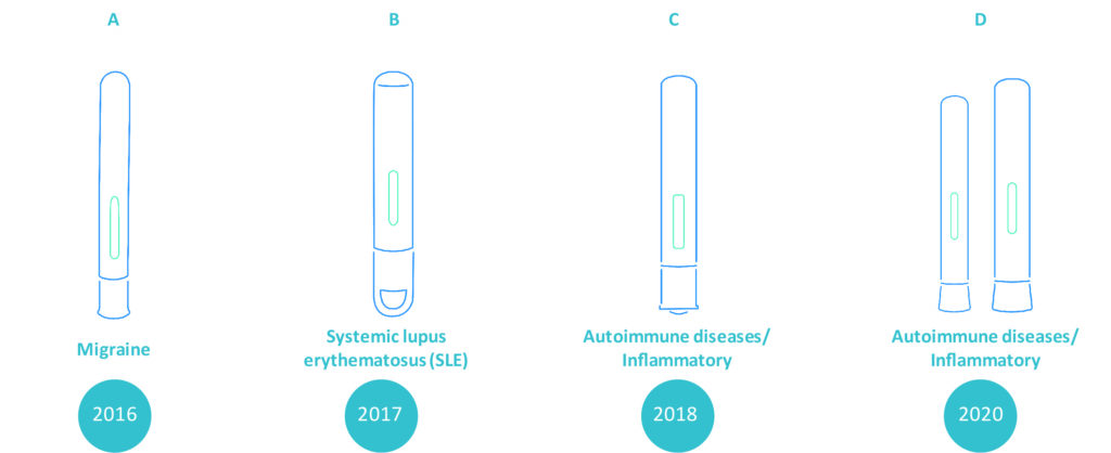 In Figure 3, the industrial design of device A compared with device B shows a stark difference in design but reflects the level of flexibility afforded by a customisable platform technology. This difference could be viewed in terms of the requirements of the drug, patients’ disease state and user-group handling needs, among others. On the other hand, device D highlights how Molly® can support lifecycle management, wherein the prefilled syringe and complex biologic have been co-developed in two device versions for varying dosing needs.