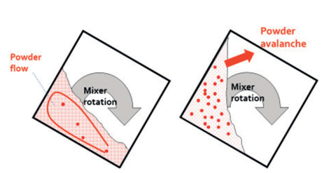 Figure 1: Free-flowing powders tend to set up a rolling motion inside the powder bed, resulting in ball milling of the API agglomerates. Poor-flowing powder tends to avalanche and results in less motion inside the powder bed and less ball milling of API agglomerates.