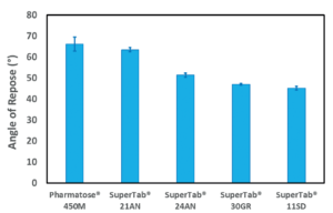 Pharmatose® 450M has the lowest particle size and thus it is not surprising it exhibits a higher cohesiveness and thus a higher angle of repose.2 However, particle size is not the only parameter affecting flow, as it also depends heavily on powder morphology, as can be observed for SuperTab® 11SD which has a spherical shape.