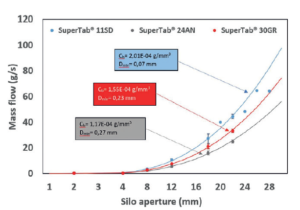 The SuperTab® 11SD has the highest Beverloo parameter and thus exhibits the best flowability through the silo aperture. This powder has also the lowest Dmin and is thus able to flow though a smaller aperture than the other ones. It is then followed by SuperTab® 30GR and SuperTab® 24AN, in this order, in total accordance with the angle of repose measurements obtained with the GranuHeap.