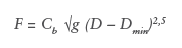 Mass flow rate (F in g/s) was investigated for different hole size D (from 2–28 mm). The Beverloo parameter (Cb in g/mm3) and the minimum aperture size to obtain a flow Dmin are deduced from the regression with Beverloo law: F = Cb √g (D – Dmin)2,5