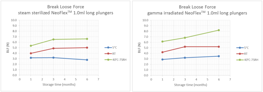 The data show that, within a specific temperature range, the break-loose and gliding forces remain low and consistent during storage, even in worst-case conditions – e.g. small barrel, big plunger (Figure 2 and Figure 3).