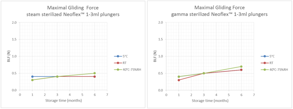 Figure 3: Maximum gliding force (MGF) measured at one, three and six months for steam sterilised (left) and gamma irradiated (right) NeoFlex 1-3 mL plungers in a standard siliconised barrel stored at different temperatures.