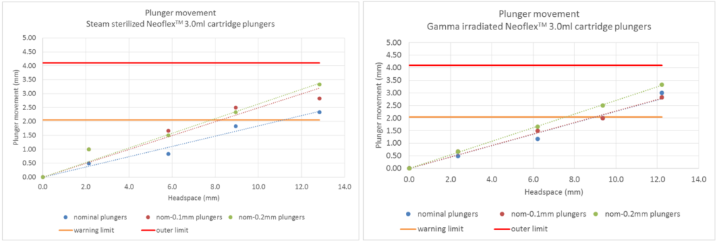 Figure 5: Plunger movement of steam sterilised (left) and gamma irradiated (right) NeoFlex plungers in 3 mL cartridges with different headspaces. Plunger movement is tested in a vacuum chamber at 752 mbara (=8000 ft) at room temperature. This condition is typical of the pressure decay in a pressurised cargo jet.